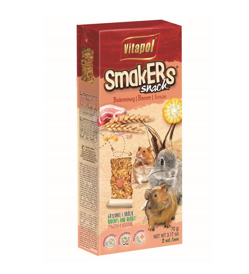 Smakers to doskonałe uzupełnienie i urozmaicenie diety wszystkożernych gryzoni, takich jak chomiki, myszy czy szczury. Dzięki dodatkowi bekonu produkt jest pożywny, delikatny w smaku i bardzo chętnie zjadany przez zwierzęta. Stanowi również cenne źródło białka zwierzęcego, wspierając prawidłowe żywienie gryzoni.