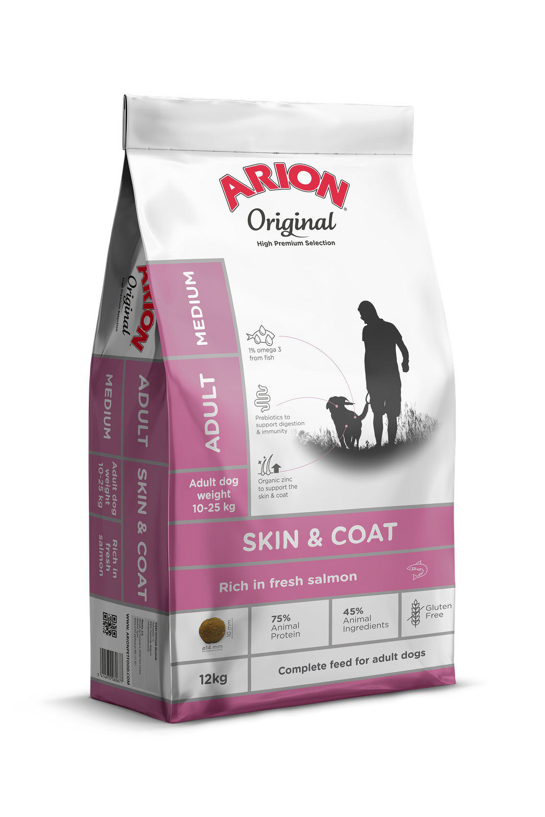 Arion Original Skin & Coat Adult Medium to pełnowartościowa karma dla psów dorosłych ras średnich, ze świeżym łososiem. Jej bezglutenowa, monobiałkowa receptura, oparta na rybach zawiera unikatową mieszankę składników pochodzenia morskiego oraz cynk organiczny, aby wspierać skórę i sierść Twojego psa.