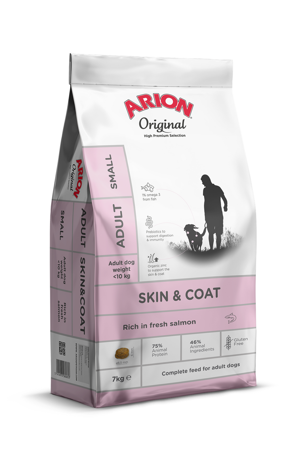 Arion Original Skin & Coat Adult Small to pełnowartościowa karma dla psów dorosłych ras małych, ze świeżym łososiem. Jej bezglutenowa, monobiałkowa receptura, oparta na rybach zawiera unikatową mieszankę składników pochodzenia morskiego oraz cynk organiczny, aby wspierać skórę i sierść Twojego psa.