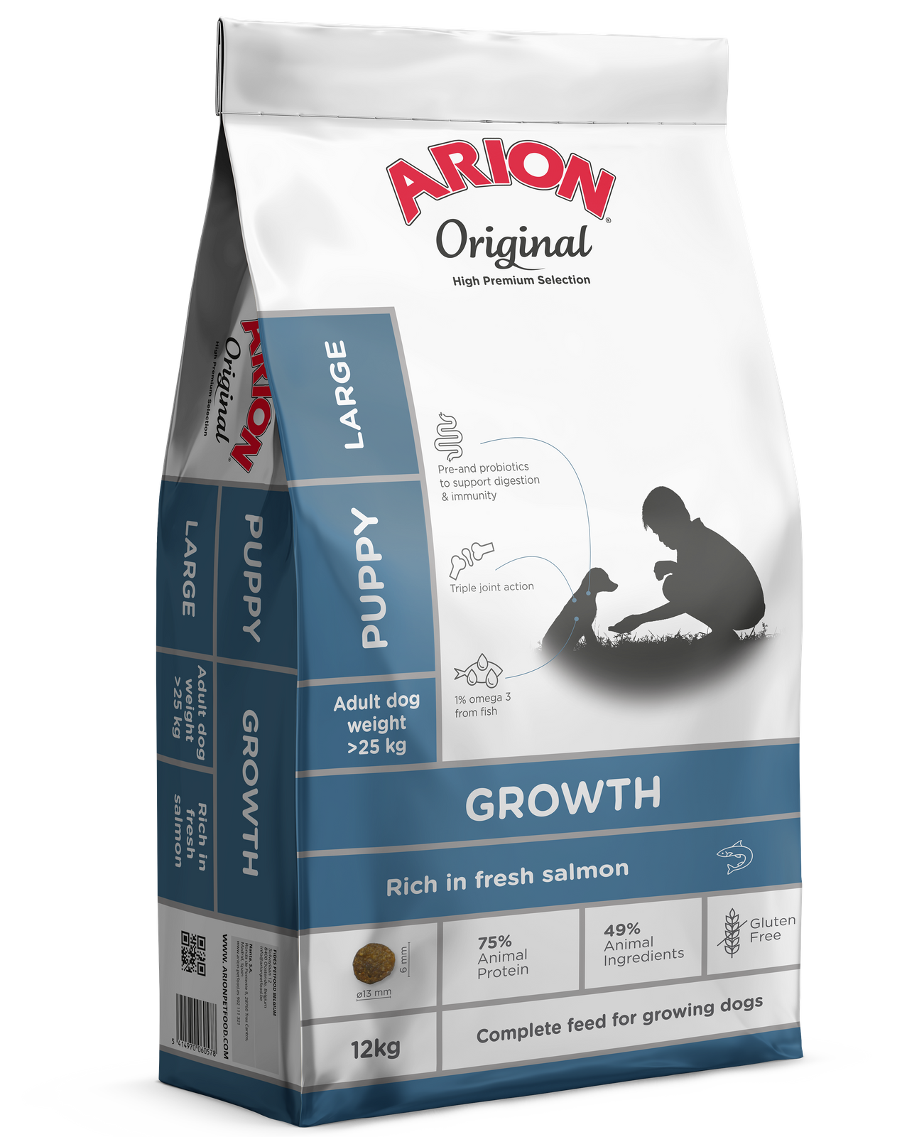 Arion Original Growth Salmon/Fish Puppy Large to pełnowartościowa karma dla szczeniąt ras dużych, ze świeżym łososiem. Jej bezglutenowa, monobiałkowa receptura oparta na rybach, zawiera unikatową mieszankę składników pochodzenia morskiego, pre- i probiotyków, chondroprotektorów oraz właściwy poziom witamin i minerałów.