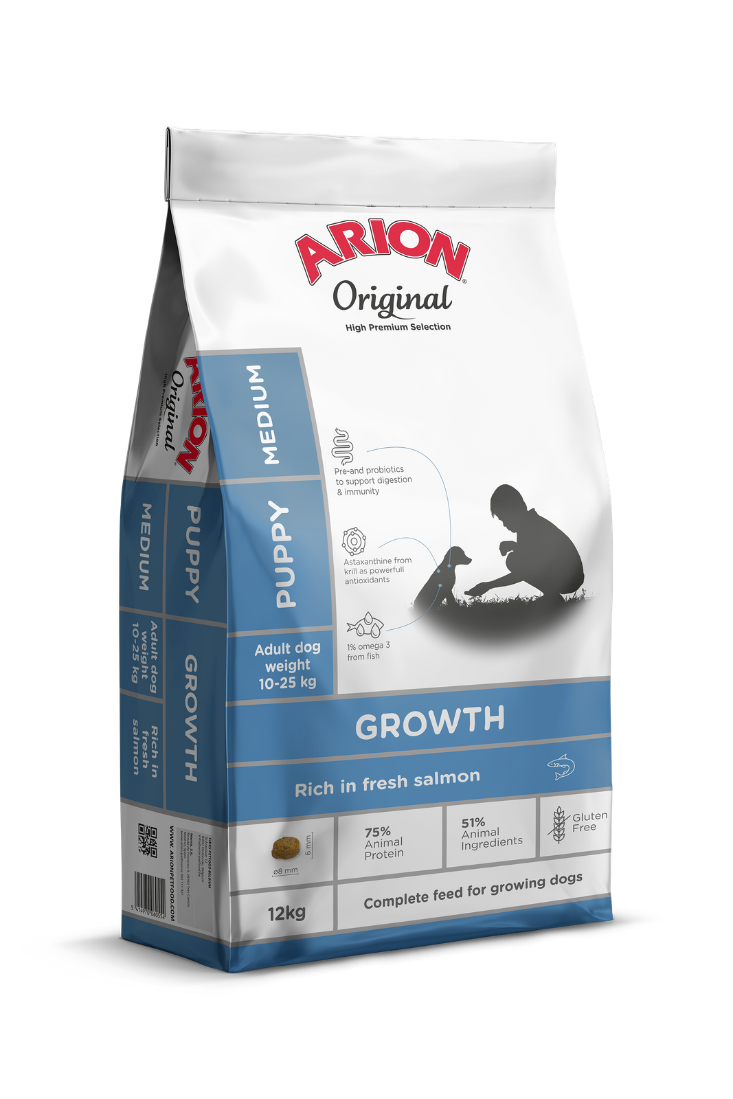 Arion Original Growth Salmon/Fish Puppy Medium to pełnowartościowa karma dla szczeniąt ras średnich, ze świeżym łososiem. Jej bezglutenowa, monobiałkowa receptura oparta na rybach zawiera unikatową mieszankę składników pochodzenia morskiego, pre- i probiotyków oraz właściwy poziom witamin i minerałów.