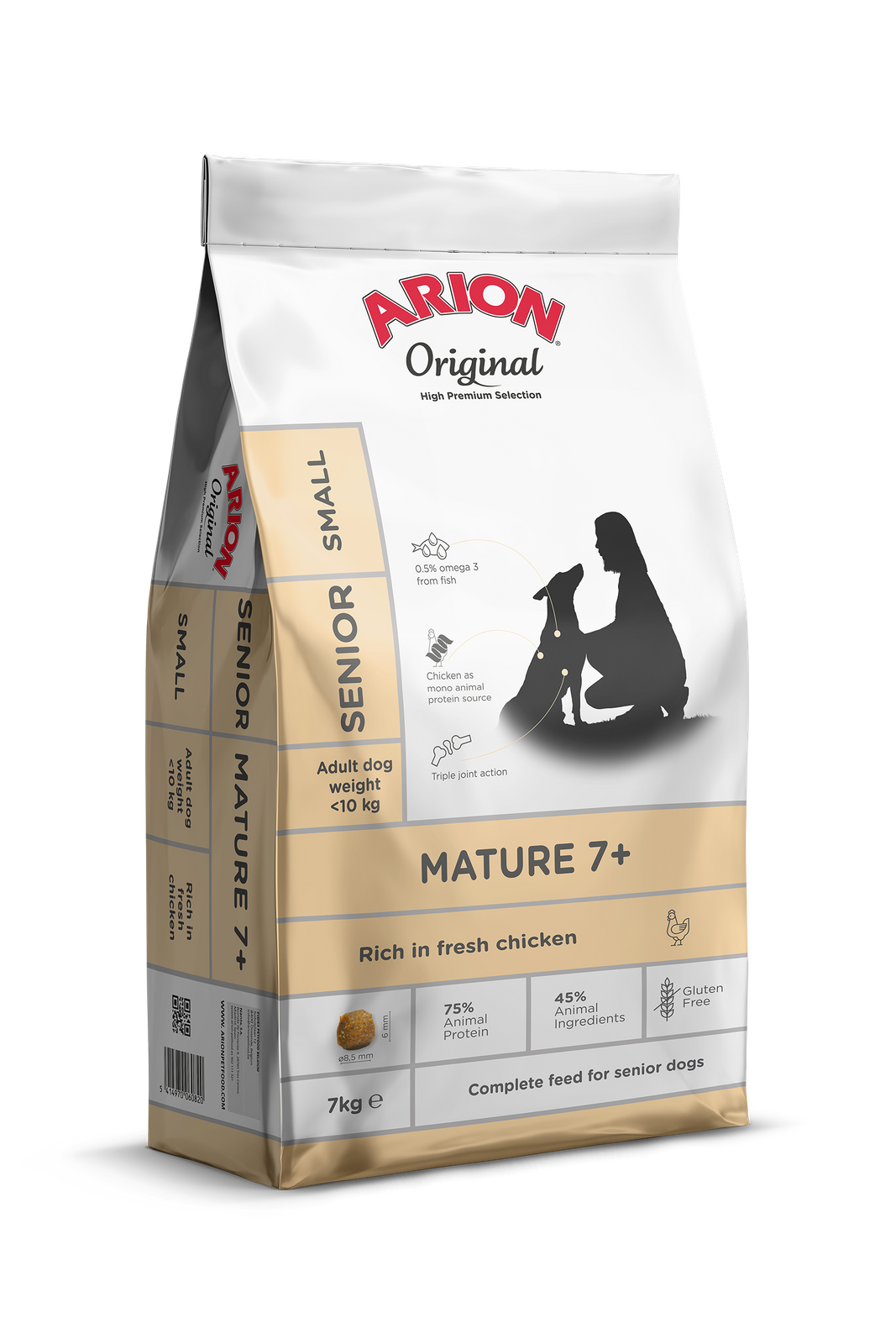Arion Original Mature 7+ Adult Small Breed to pełnowartościowa karma dla dojrzałych i starszych psów ras małych, ze świeżym kurczakiem. Jej bezglutenowa, monobiałkowa receptura zawiera lekkostrawnego kurczaka, kwasy Omega-3 pochodzenia morskiego oraz mieszankę chondroprotektorów.