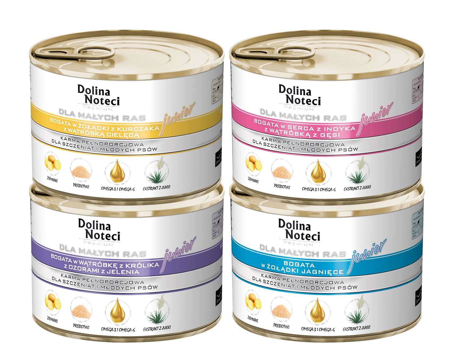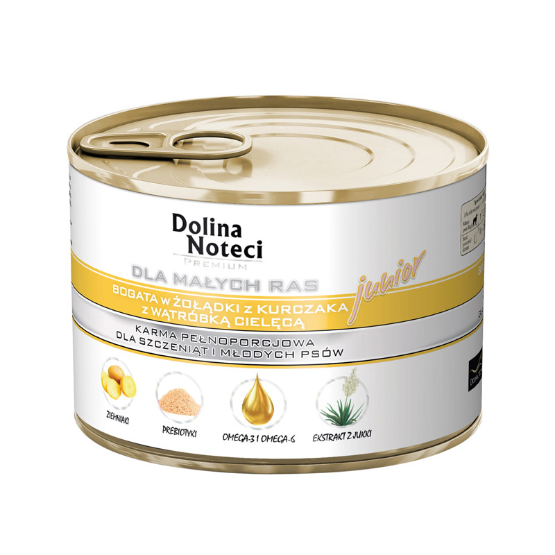 • 6 x Dolina Noteci Premium JUNIOR dla małych ras bogata w żołądki z kurczaka z wątróbką cielęcą 185g