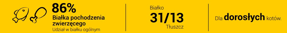 kład: suszone białko drobiowe, ryż, kukurydza pełnoziarnista, skwarki, wysłodki buraczane, tłuszcz drobiowy, suszony łosoś 6,0%, hydrolizowane białko drobiowe, minerały, suszona wątróbka drobiowa, olej z łososia 0,50%