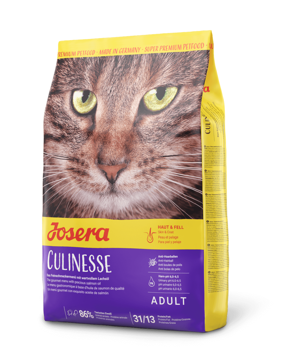 Josera Emotion Culinesse z delikatnym drobiem i łososiem jest szczególnym pożywieniem dla wymagających kotów. Karma ma w swoim składzie specjalne, dietetyczne włókno wspomagające pracę jelit. Dzięki wysokiej strawności, włosy usuwane są naturalnymi drogami. Biotyna, kwasy tłuszczowe Omega 3 i Omega 6 wpływają na zdrową skórę i lśniącą sierść. Witaminy A + E wzmacniają ochronę i wspomagają system immunologiczny Waszego kota.