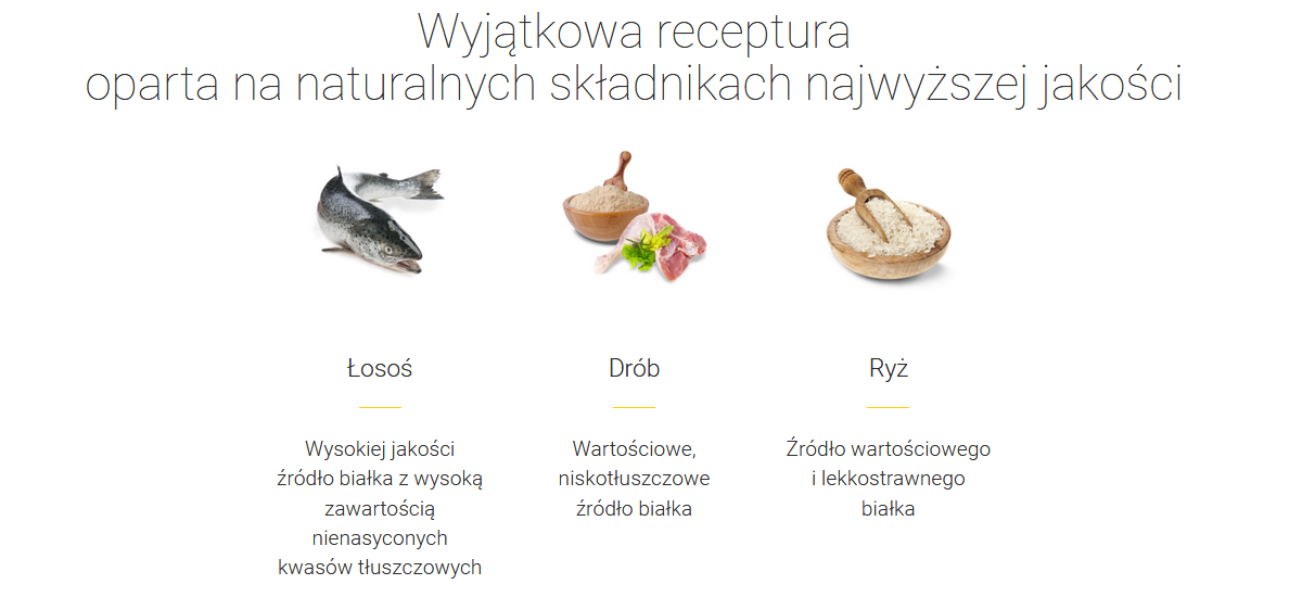 Skład: suszone białko drobiowe, ryż, tłuszcz drobiowy, skwarki, wysłodki buraczane, suszony łosoś, suszone ziemniaki, hydrolizowane białko drobiowe, wątróbka drobiowa, olej łososia 0,50%, minerały