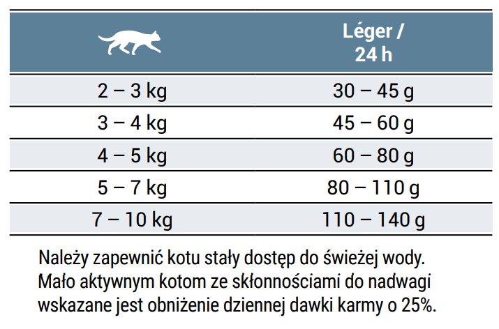 Josera Emotion Leger to karma ze zredukowaną zawartością tłuszczu, idealna dla kotów o niskim poziomie aktywności, walczących z nadwagą lub kotów po kastracji. Zwiększona zawartość wypełniaczy powoduje uczucie sytości przy niewielkim dopływie energii. Przy karmieniu dostosowanym do potrzeb Waszego kota, możecie Państwo w stosunkowo krótkim czasie osiągnąć spadek wagi u zwierząt które tego potrzebują. Josera Emotion Leger dzięki ograniczonej zawartości tłuszczu i zbilansowanym składzie jest również karmą dla starszych kotów.