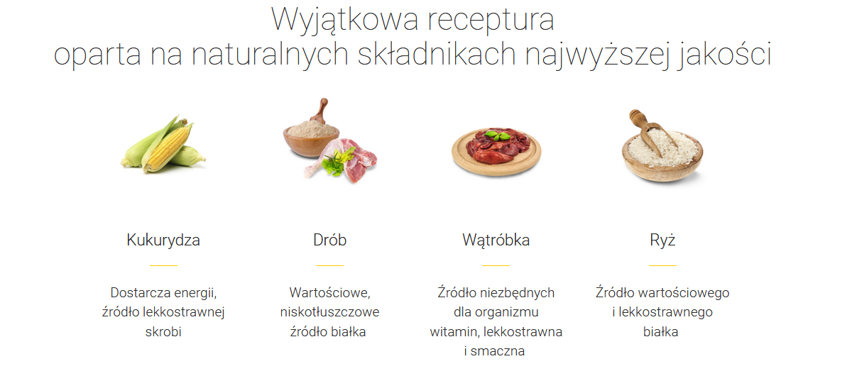 Skład: suszone białko drobiowe, kukurydza pełnoziarnista, skwarki, ryż, włókna roślinne, wysłodki buraczane, tłuszcz drobiowy, hydrolizowane białko drobiowe, minerały, suszona wątróbka drobiowa, łuski nasion babki płesznik (Psyllium)