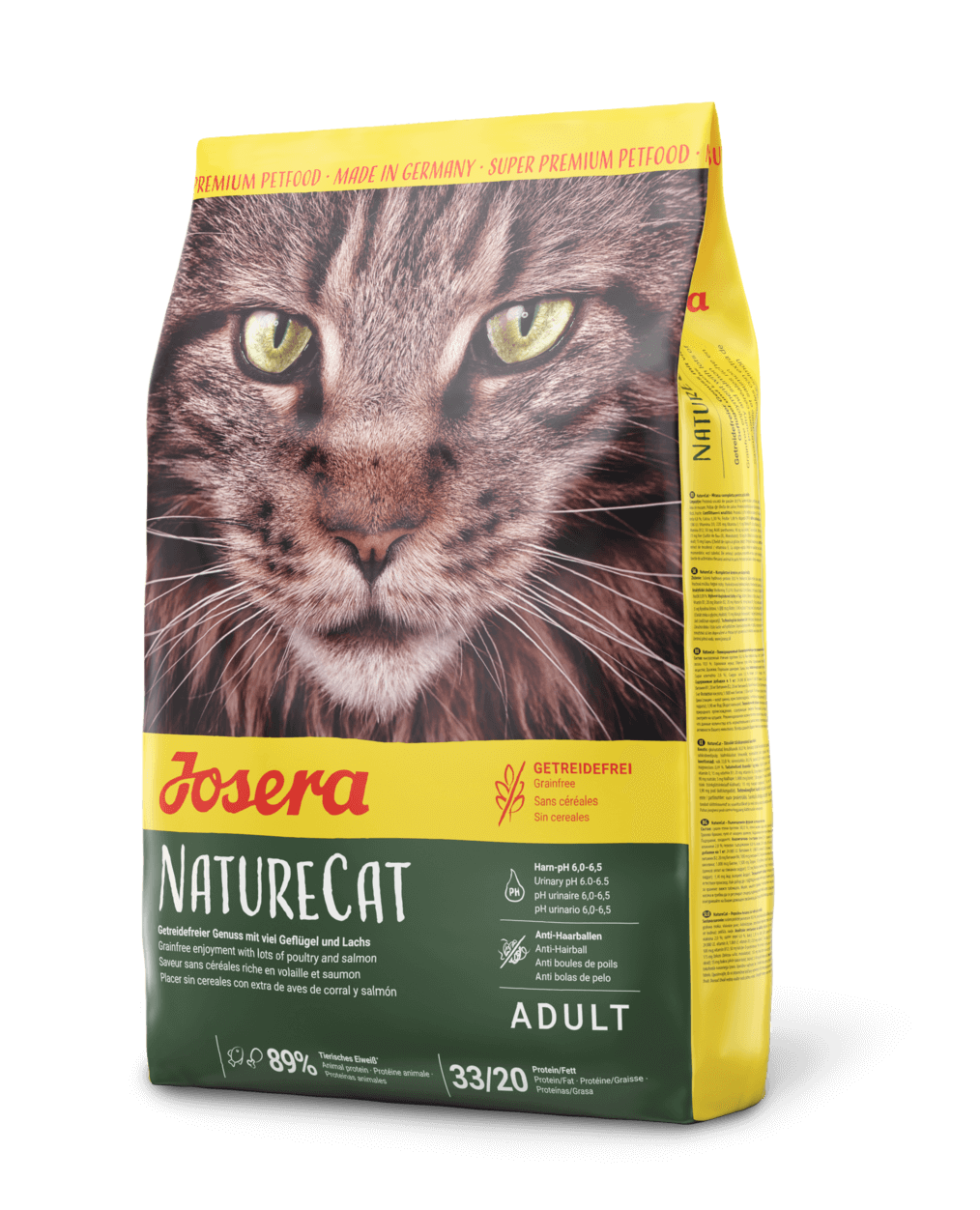 Czy Twój kot nie toleruje zboża i jest prawdziwym tygrysem? Karma JOSERA NatureCat to prawdziwy rarytas dla kotów odkrywców i poszukiwaczy przygód. Bezzbożowa karma dla kota zawiera formułę, która szczególnie polecana w codziennej diecie wrażliwych kotów i kociąt od 6 miesiąca życia.