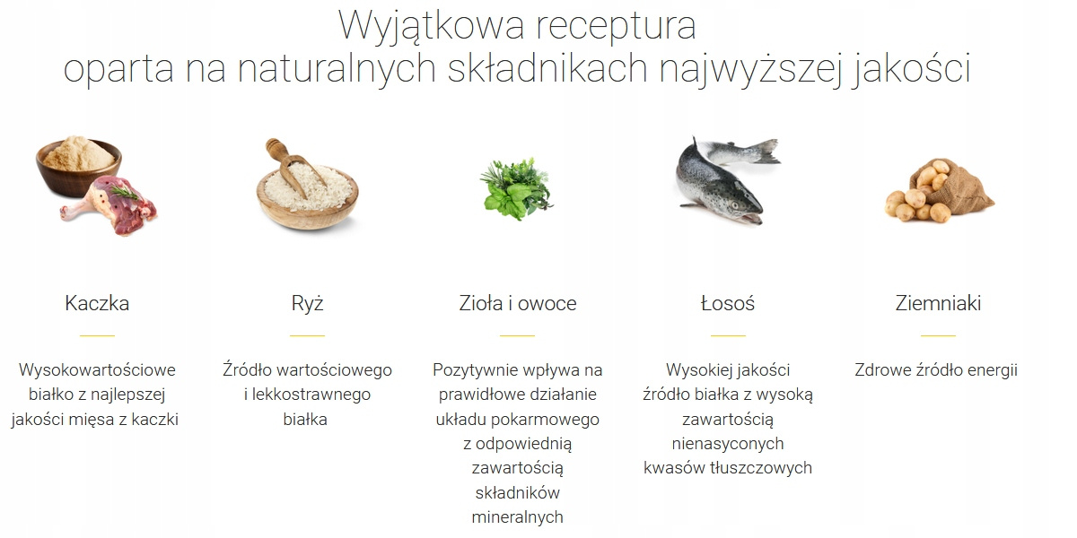 Skład: suszone białko drobiowe (drób 20,0%, kaczka 4,0%);ryż; tłuszcz drobiowy; suszone ziemniaki; białko ziemniaczane; wysłodki buraczane; suszone białko łososia 4,0%; hydrolizowane białko drobiowe; mączka z chleba świętojańskiego; hydrolizowane białko zwierzęce; minerały 0,35%; trójpolifosforan sodu; drożdże; suszony korzeń cykorii; zioła; owoce; suszone mięso nowozelandzkich małż zielonych;