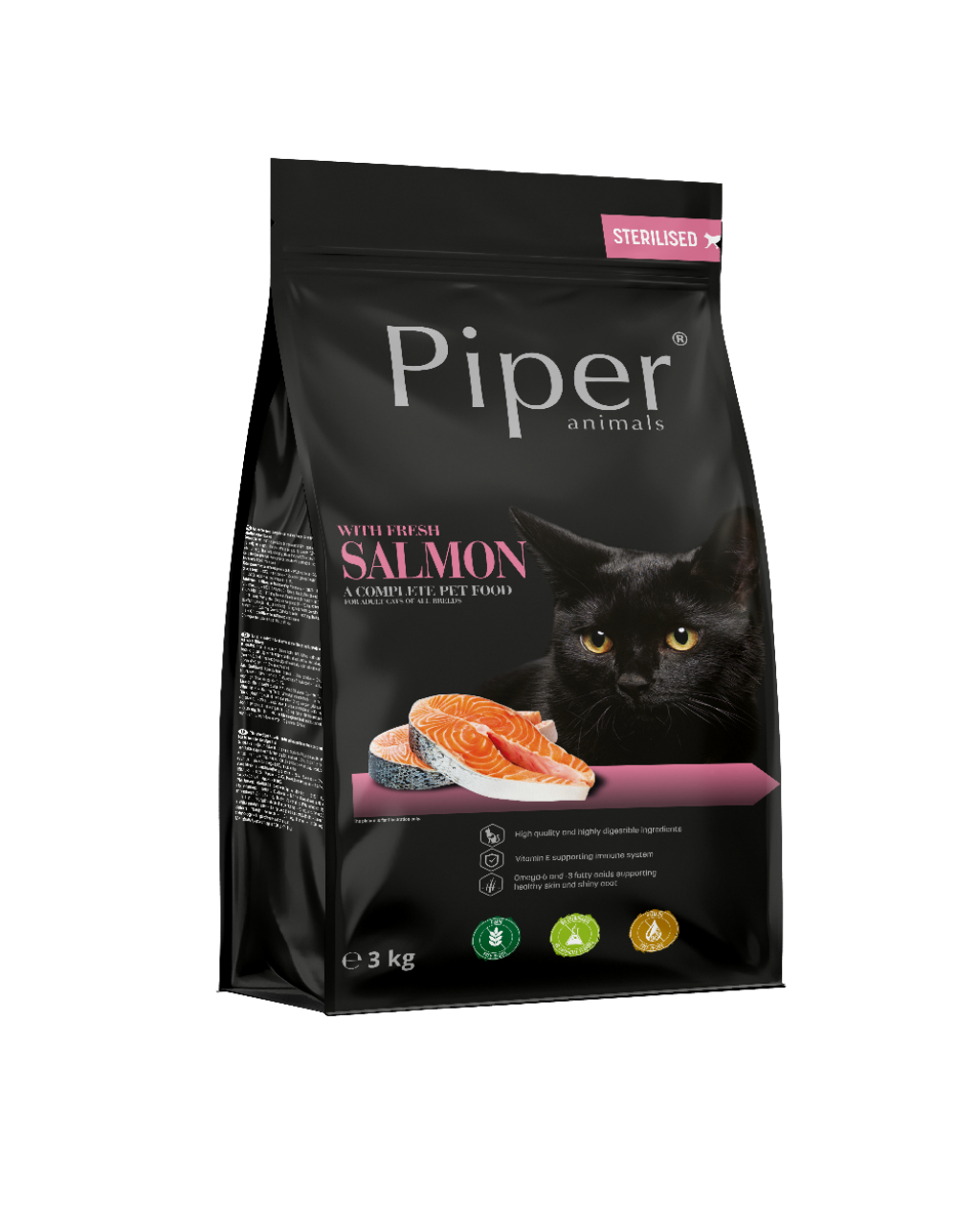 Piper Animals to pełnoporcjowa karma dla kotów po sterylizacji z dodatkiem świeżego mięsa łososia. Bogata w  białka i tłuszcze, którego źródłem są mięso i produkty pochodzenia zwierzecego. Unikalna receptura i starannie dobrane produkty z których stworzona została karma,  wpływają na jej smakowitość, dostarczając niezbędnych składników odżywczych, minerałów i witamin oraz wspomagają prawidłową pracę całego organizmu Twojego Pupila.