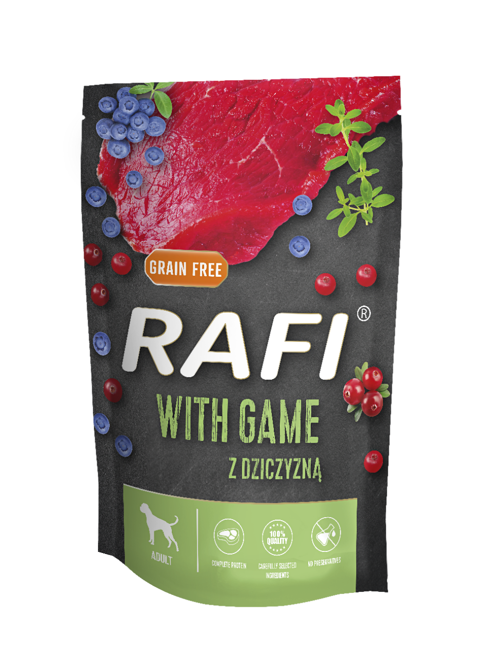 Linia RAFI to pełnoporcjowe karmy pokrywające w 100% dzienne zapotrzebowanie na wszystkie składniki odżywcze, mineralne i witaminowe. Ich skład został zbilansowany w oparciu o nowoczesne normy żywieniowe i zalecenia prawidłowego żywienia psów dorosłych, młodych oraz szczeniąt. Mokre karmy Rafi zapewniają odpowiednie zmineralizowanie kości i zębów oraz właściwy przebieg procesów metabolicznych. Receptura wolna jest od substancji konserwujących, barwników oraz aromatów poprawiających smak oraz stymulujących apetyt. Wykorzystanie mięsa i surowców pochodzenia zwierzęcego oraz ich precyzyjne zestawienie sprawiają, że produkty te są źródłem pełnowartościowego białka zawierającego wszystkie aminokwasy egzogenne. Dzięki nowoczesnej metodzie produkcji oraz starannej selekcji karmy Rafi odznaczają się wysokim współczynnikiem strawności.