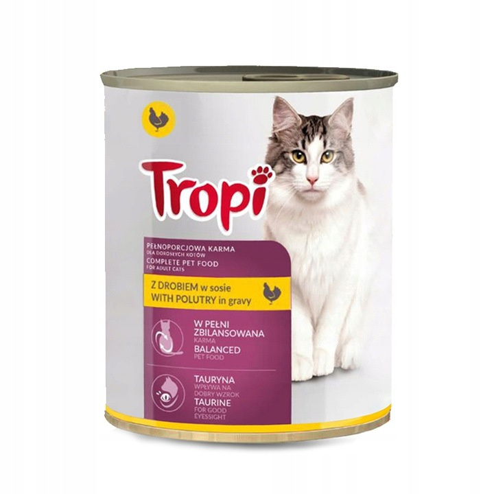 Tropi to pełnoporcjowa karma dla kotów wszystkich ras, składająca się z mięsistych, soczystych kawałków zanurzonych w aromatycznym sosie. To kompletny i zbilansowany posiłek, który wspiera prawidłowe funkcjonowanie organizmu Twojego kota każdego dnia. Dzięki starannie dobranym składnikom odżywczym, karma Tropi nie tylko doskonale smakuje, ale również pozytywnie wpływa na zdrowie i samopoczucie zwierzęcia.