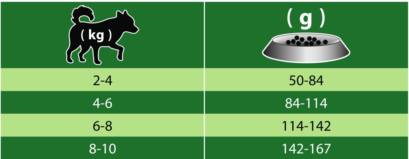 Dzienną porcję należy podzielić na 2-3 posiłki. Dostosuj dzienną ilość karmy do poziomu aktywności, kondycji fizycznej i indywidualnych potrzeb Twojego psa. Zalecane dzienne dawki karmy mogą ulec zmianie w zależności od indywidualnego zapotrzebowania psa. Ilość karmy należy zwiększyć o 10-15% w okresie zwiększonego wysiłku psa lub gdy zimą przebywa na zewnątrz.